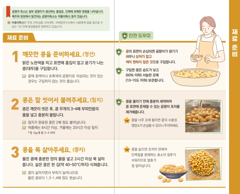 식품의약품안전처(처장 김강립)는 가정에서 본격적으로 된장을 담그기 시작하는 11월(가정에서 된장을 직접 만들어 소비하는 1,261명(’18~’20)에 대해 된장 세부 제조방법에 대한 설문조사를 실시한 결과, 메주 제조 시기는 11월~12월(50.6%), 된장 담금시기는 1월~2월(77.2%)로 응답한 사람이 가장 많았음)을 앞두고 아플라톡신 생성을 저감시킬 수 있도록 ▲원료 선택·세척 ▲메주 제조 ▲된장 담그기 ▲된장 숙성 과정에서의 유용한 정보를 안내한다.