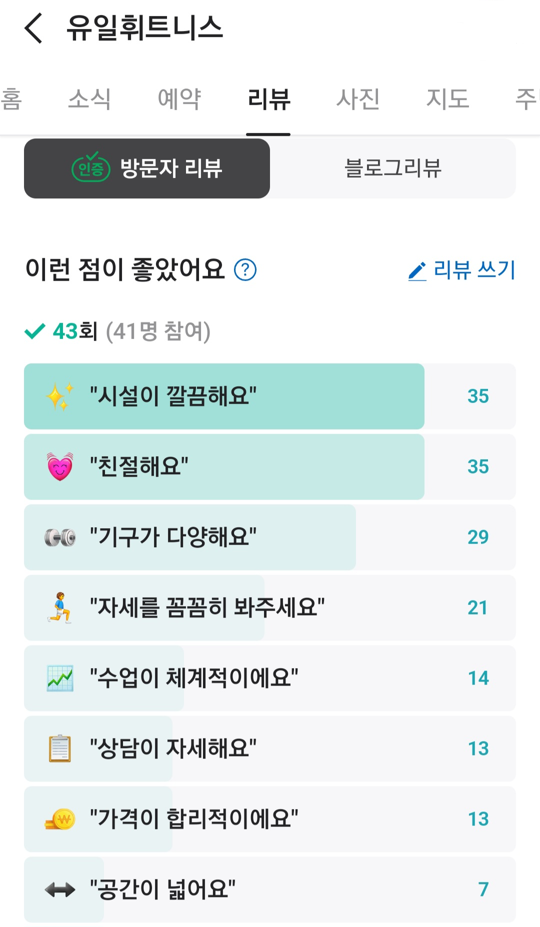 깔끔한 시설, 친절, 다양한 기구, 꼼꼼하게 자세 봐주기, 체계적인 수업, 자세한 상담, 합리적인 가격, 넓은 공간, 과도한 권유가 없다, 실력 좋은 트레이너, 맞춤 케어 잘해 준다, 다양한 GX 프로그램, 잘 된 샤워실 등 순으로 평가하고 있음이 확인됐다.