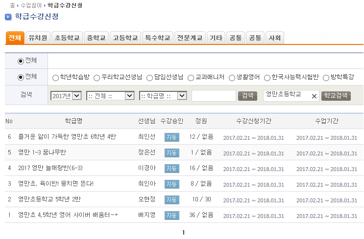 자신이 다니는 학교 검색 후 수강하고 싶은 반을 수강 신청한다. (대부분 자동 수락)