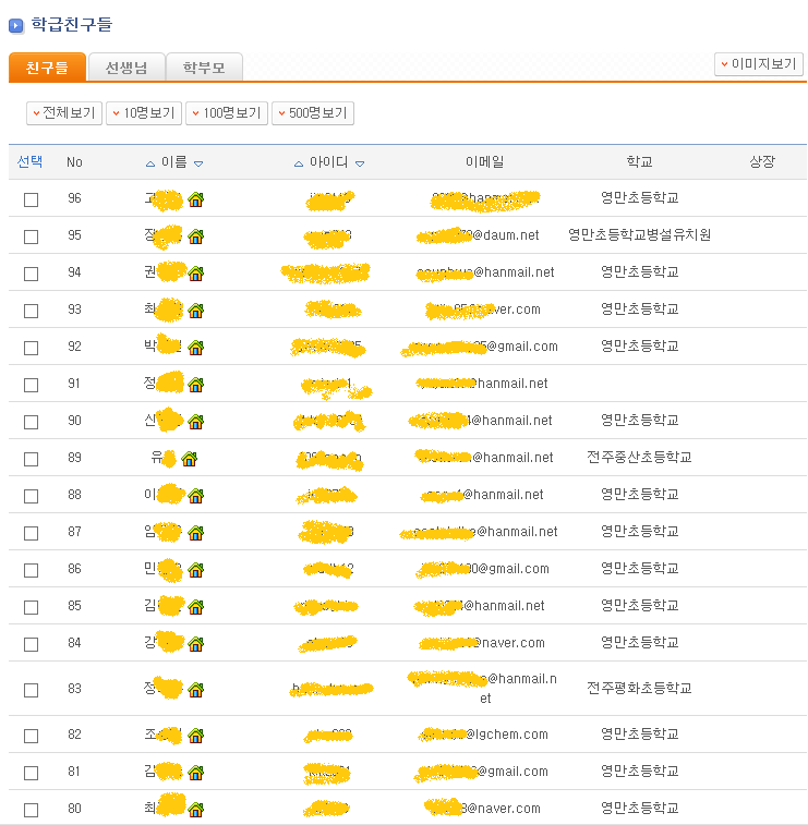 왼쪽의 학급친구들을 누르면 이 수업을 신청한 친구들의 이름,아이디,이메일이 보인다.