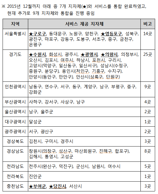 다만 개별 지자체 서비스에 이미 가입한 사람의 경우도 이번 통합 서비스를 받기 위해서는 개인정보 제공동의 등 새로 가입절차를 거치는 것이 필요하다.