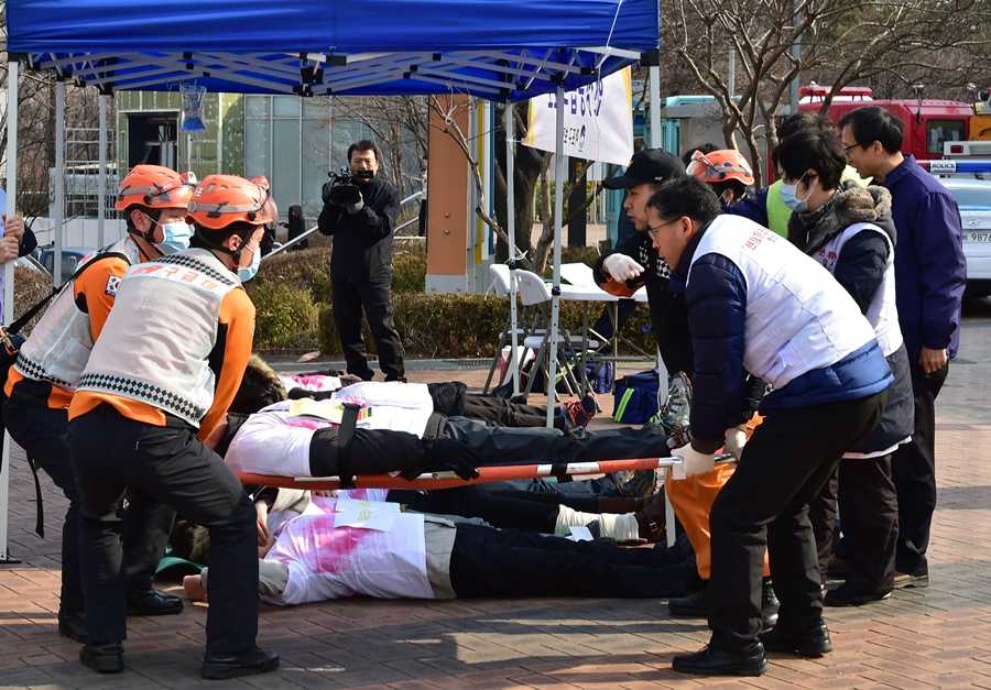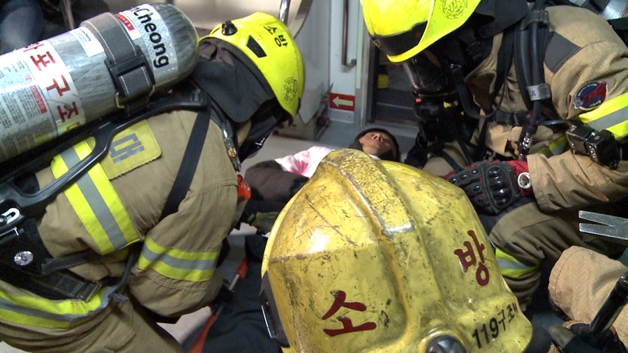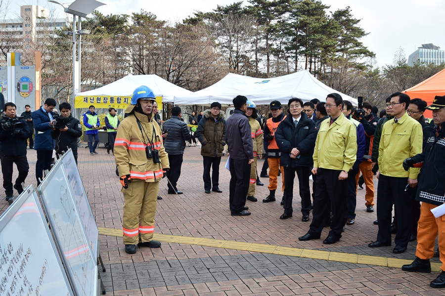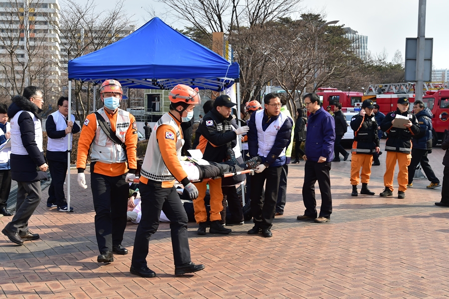 국민안전처와 서울도시철도공사 주관으로 25일 오후 마포구청역~월드컵경기장역(6호선)에서 화재진화, 승객 구조,구급, 응급의료소 운영 등 지하철 대형사고 대응 불시 현장 훈련 실시하고 있다.