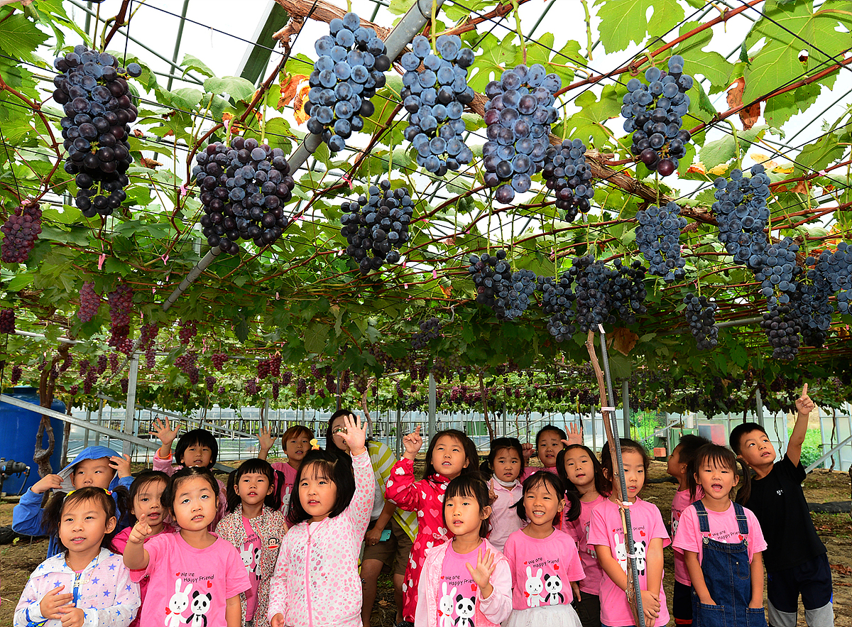 본격적인 포도 출하 철을 맞아 옥천 청산유치원생들이 충북농업기술원의 포도연구소를 방문, 포도연구소가 자체 개발한 ''충랑'' (忠琅, 충북대표 포도로 중요하고 기본이 되는 포도 의미)을 살펴보고 있다.
