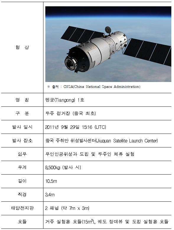 과학기술정보통신부(장관 유영민, 이하 ‘과기정통부’)는 추락 중인 중국 우주정거장 ‘톈궁 1호’가 3월 26일(월) 현재 고도 203㎞에 진입하였으며, 3월 30일(금) ~ 4월 3일(화) 사이 시점(한국시간 기준)에 지표면 추락이 예상된다고 밝혔다.