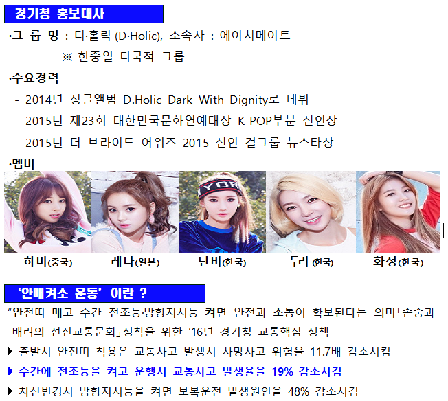 한편, 그룹 디홀릭측 관계자는 홍보대사 위상에 걸맞게 교통사고 사망자 감소를 위해 경기청에서 추진하고 있는 안매켜소 운동에 기여하기 위해 ‘안매켜소 운동’ 홍보 CM송을 직접 부르고, 경기청 홍보단과 함께 뮤직비디오도 제작, 도민 모두가 관심을 가질 수 있도록 적극 노력할 것이라고 밝혔다.