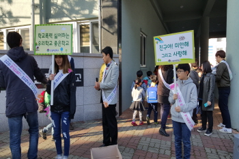 특히 전교학생회 학생들은 자율적으로 예방 구호를 만들고, 홍보 피켓을 들어 등교하는 학생들에게 밝은 인사를 하며 행복하고 안전한 학교 만들기 캠페인 활동을 했다.