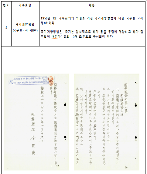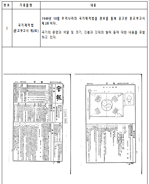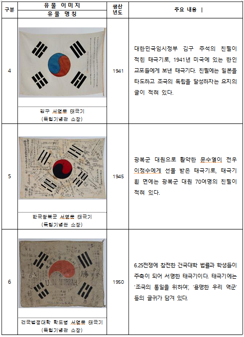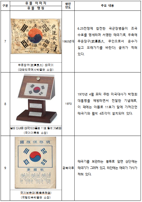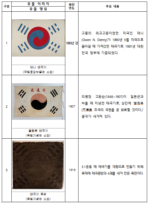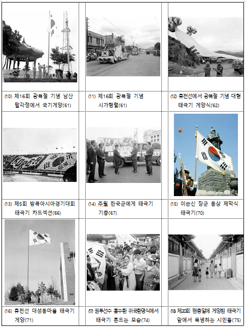 ◉ 태극기(‘63), 북녘에 태극기를(’71), 가장 오래된 태극기(‘81) 등 동영상 5건 ◉ 서울 수복 후 태극기 게양(‘50), 3.1절 행사 태극기 입장(‘52), 독립문에 새겨진 태극기(‘56), 휴전선 대성동마을 태극기 게양(‘71) 등 사진 21건 ◉ 대한민국 국기제정에 관한 건(‘49), 국기게양방법(’50) 등 문서 4건 ◉ 광복 1주년 기념우표(‘46), 태극기 달기 특별기간 포스터(’98) 등 우표∙엽서∙포스터 6건 ◉ 데니 태극기(1890년 경), 한국광복군 서명문 태극기(‘45) 등 유물 9건 |