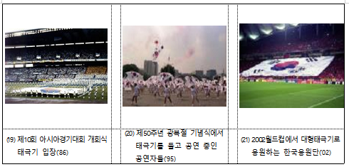 또한, 태극기는 올림픽, 아시아경기대회 등 국제경기에서 메달을 획득한 선수의 온몸에 휘감기며 환희의 상징으로 사용됐고, 선수들의 힘을 북돋워 주기 위한 응원의 도구로도 한 몫을 담당했다.