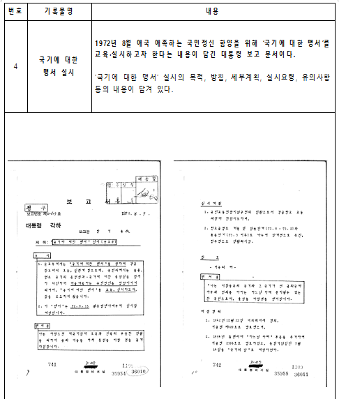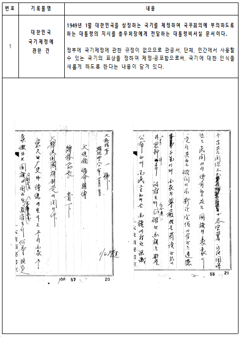 이번에 제공되는 기록물은 총 45건(동영상 5, 사진 21, 문서 4, 우표․엽서․포스터 6, 유물 9)으로, 태극기의 변천과정과 국경일 및 기념일 등 각종 행사에 사용되었던 태극기의 모습을 보여주고 있다. 금번 기록물에는 국가기록원 소장 기록물뿐만 아니라 독립기념관, 국립민속박물관, 국립중앙박물관, 대한민국역사박물관 소장 기록물도 포함되어 있다.
