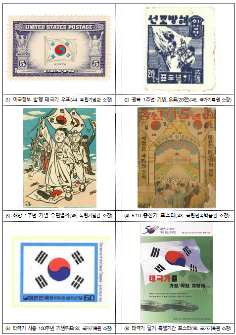 특히, 서비스 기록물 중 미국정부가 한국인의 독립투쟁 의지를 기념하기 위해 1944년 발행했던 태극기 우표와 광복 1주년을 맞아 발행된 기념우표 및 엽서가 눈에 띈다. 또한, 광복 이후 우리나라 최초의 선거인 5. 10. 총선거 포스터에는 ‘기권은 국민의 수치, 투표는 애국민의 의무’라는 표어와 함께 태극기가 실려 있어 선거권 행사를 애국심 차원으로 연결시킨 점이 특이하다.