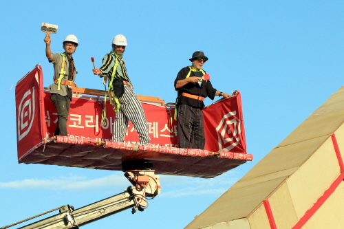 지난 3일 직지코리아국제페스티벌 청주예술의전당 광장에 있는 직지 파빌리온에서 창작자인 론 아라드와 직지코리아 주제전시 공간 연출가 에이브 로저스, 그래피티 아티스트 메녹, 시민대표 등이 퍼포먼스를 진행했다.