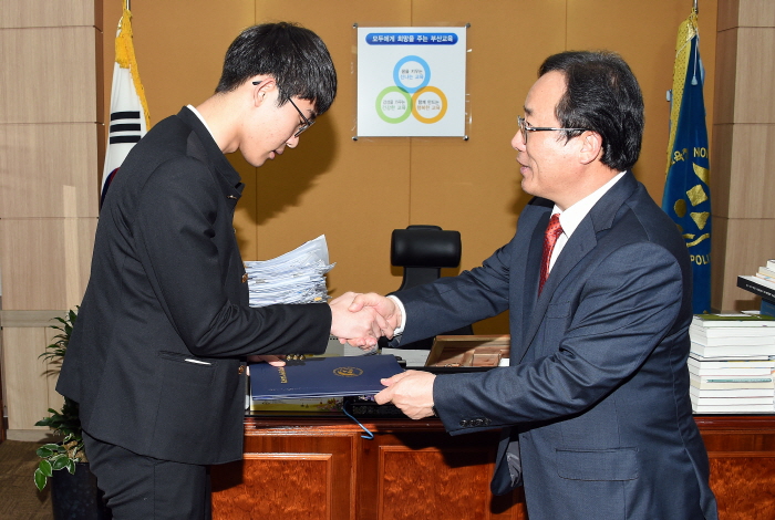김석준 부산광역시교육감이 18일 오후 4시30분 교육감실에서 최근 발생한 구포빌라 화재때 초인종을 눌러 주민들을 신속하게 대피시킨 성도고등학교 2학년 강태혁 학생에게 ‘모범학생상’을 수여하고 격려했다.