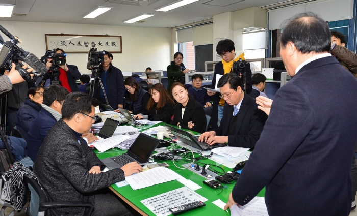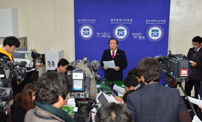 장휘국 광주시교육감은 31일(화) 오전 11시 30분 시교육청 브리핑실에서 교육부가 이날 오전 발표한 국정 역사교과서 최종본 공개에 따른 광주광역시교육청의 입장과 대책을 담은 긴급기자회견문을 발표하고 참석한 기자들과 일문일답을 실시했다.장휘국 교육감은, 광주시교육청은 국정역사교과서가 현장에 발붙이지 못하게 모든 역량을 동원하겠다며, 국정교과서 사용의 빌미를 주지않기 위해 연구학교 지정 및 대행업무를 하지않겠다고 분명히 밝혔다.