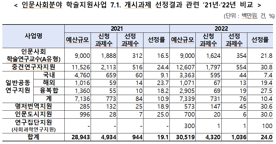 전년 대비 7.1. 개시과제의 선정 과제 수 및 선정률은 확대됐으며, ①우수연구자 양성을 위한 학문후속세대의 안정적인 연구활동 지원(인문사회학술연구교수 A유형) ②4차산업혁명 시대에 대응한 융복합 연구 활성화(일반공동연구지원 중 융복합 유형) ③인문사회분야 학술·연구를 위한 기초자료 축적(명저번역지원) 측면에서 지원이 확대됐다.