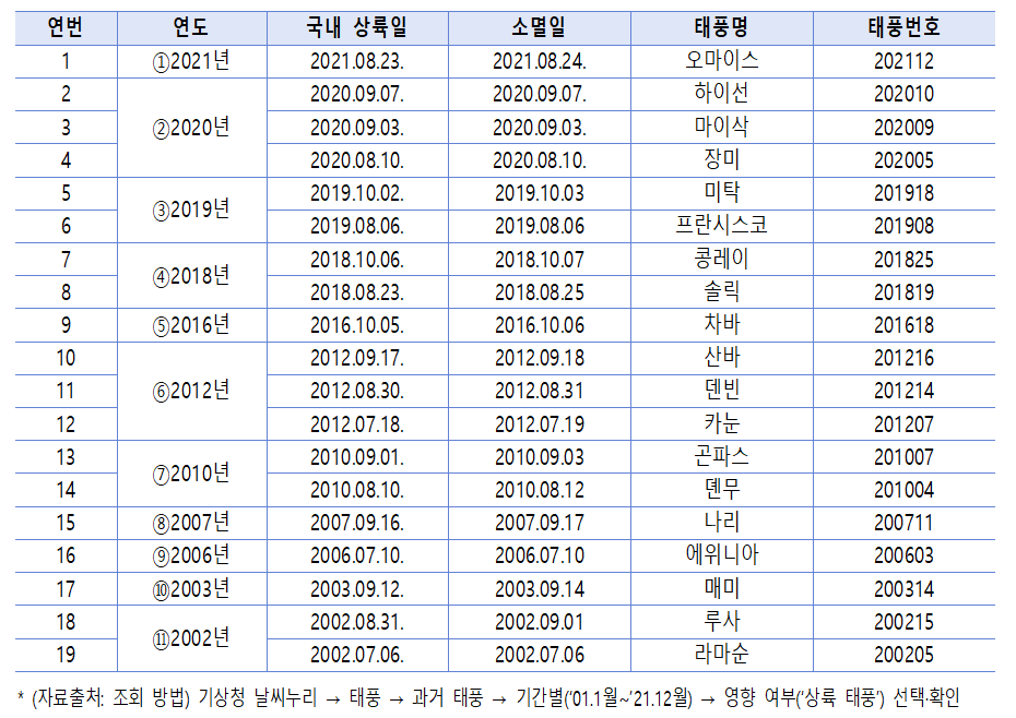 이를 기준으로 태풍이 상륙하고 소멸한 이후 7일간 효과적으로 어떤 산재사고를 예방하기 위해 집중해야 할지 확인하기 위해 최근 20년간(2002~2021년) 우리나라에 상륙한 태풍을 고려해 산재 사망사고 현황을 분석했다.