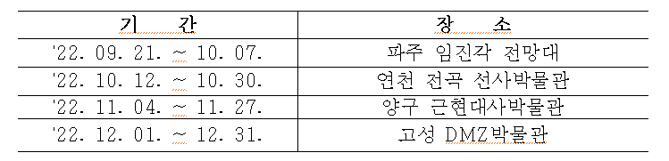 한반도 비무장지대(DMZ) 실태조사 성과공개 국내 순회전 일정은 다음과 같다.