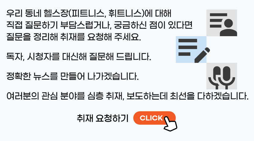▶「대신 질문해 드립니다, 헬스장 돋보기」 취재 목적은 지역 내에서 개인들의 건강생활·체력증진을 위해 시설 선택에 도움 되는 관련 정보를 정리함으로써, 헬스장(피트니스, 필라테스 등)은 홍보가 되고,