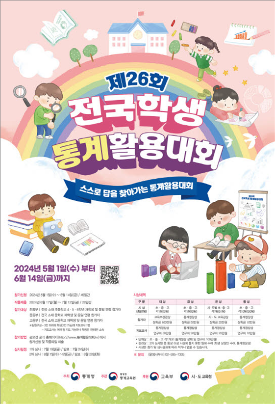 통계청(청장 이형일)은 전국 초·중·고교 재학생 및 동일 연령 참가자를 대상으로 제26회 전국학생통계활용대회(5.1.~ 6.14.)를 개최한다.