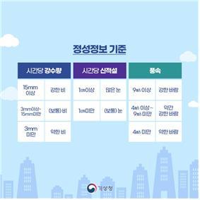 한편, 기상청은 국민이 직관적으로 체감할 수 있도록 강수량·신적설·풍속 정성정보를 제공하기 위해 과거 30년(1994∼2023년) 동안의 관측자료 분석, 대국민 설문조사, 내부 예보관 및 외부 전문가 자문 등을 거쳐 2∼3단계로 구성된 정성정보 기준을 마련했다.