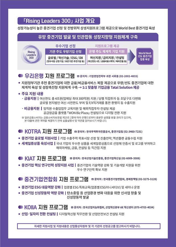 산업통상자원부(장관 안덕근)와 우리은행(은행장 정진완)은 「라이징 리더스(Rising Leaders) 300」 프로그램을 통해 올해 약 80개 우수·유망 중견기업을 대상으로 최대 1조 원 규모의 우대금융을 지원할 계획이다.